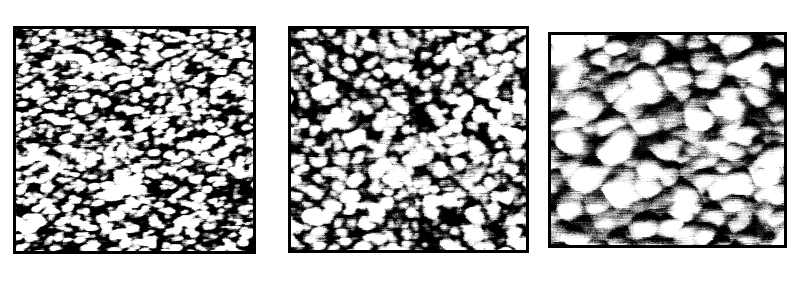 AFM scans (1 micron by 1 micron) od CdS sputter-deposited on glass at 250 C at different thicknesses (from left to right): 0.05 micron, 0.10 micron, and 0.2 micron.