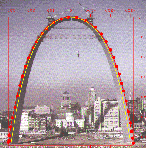 I digitized the photo below, taken the day the arch was topped-off (you can see the final section being moved into place) and fitted the measurements to a catenary getting: