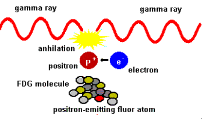 Two counter-propagating 511 Mev gamma rays are detected simultaneously.